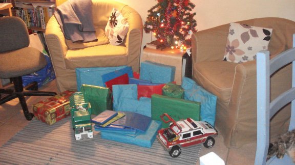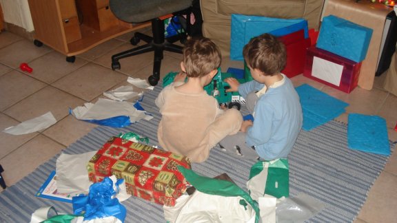 This year is the first year that Jonah and Owen have figured out what Christmas is all about: Santa and presents. So we decorated the tree, baked cookies and put out carrots for the reindeer. And the kids scored! A couple of nice toys for each, and 26 books total, 16 of which were in French. That’s a lot of bedtime stories! Eddy got some nice sweaters from my dad and I got a cooking pot from Ikea that I’ve been eyeing for a while. Plus a CD from my new favorite singer, Yael Naim.