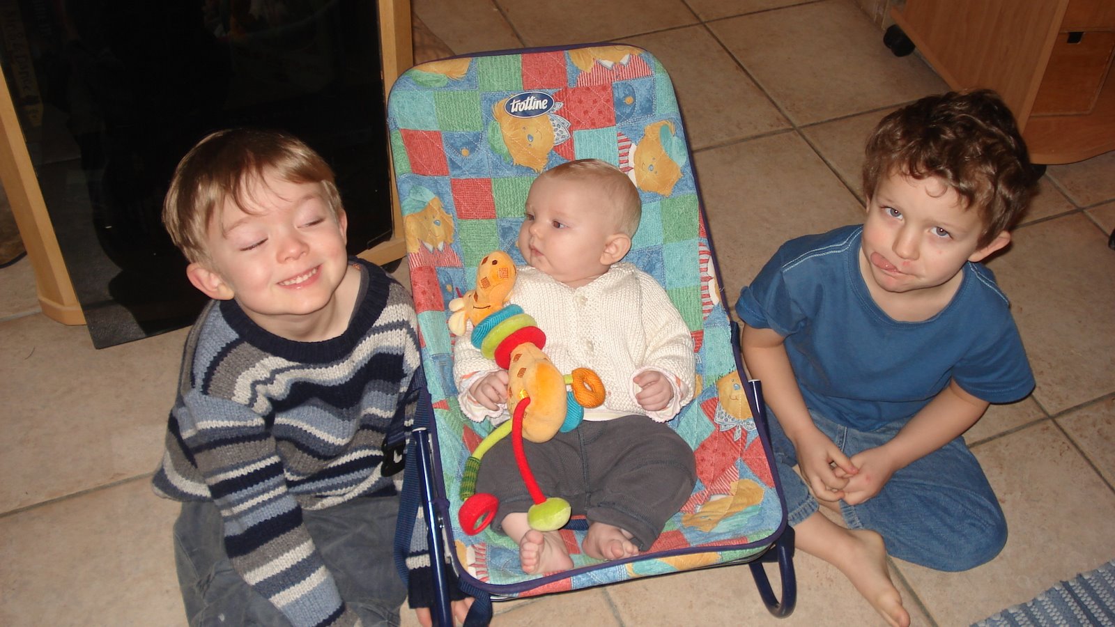 Today is Kate’s three month birthday, and I’m writing this with her howling on my lap, so it’s gonna be a short one! She’s gotten very expressive over the last month (besides the howls) as she’s learned to coo and gurgle. We practically hold conversations! We’ve had to do a lot of respitory therapy over this past month, as her lungs don’t seem to be able to decongeste on their own, and as the whole family enters into another bout of colds, I predict we’re going to keep going to the kiné. She’s already learned not to like it, poor girl, and starts howling as soon as I put her down on the table. She loves her brothers, and responds really well to them, which encourages them to smother her in kisses!!