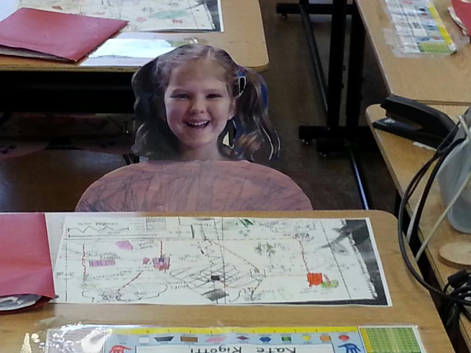 Kate’s kindergarten teacher might not have scored perfect marks on the organizational score (certainly a change from the ever organized Isabelle and Francoise), but she was very creative. This end of the year project involved the kids making close to life-size paper dolls of themselves. We loved this picture of Kate.