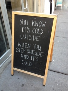 One of things that I have noticed is how much more bundled up people here dress. It’s a beautiful sunny day, blue skies, in the low fifties, and people are wearing wool coats, scarves, gloves, hats and all. And then there’s this.