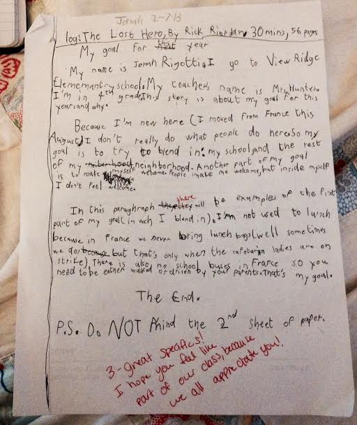 Here is a piece of writing that Jonah did in the middle of fourth grade, on February 7, 2013. It’s either titled “log: The Lost Hero by Rick Riordan” or “My goal for next this year”.