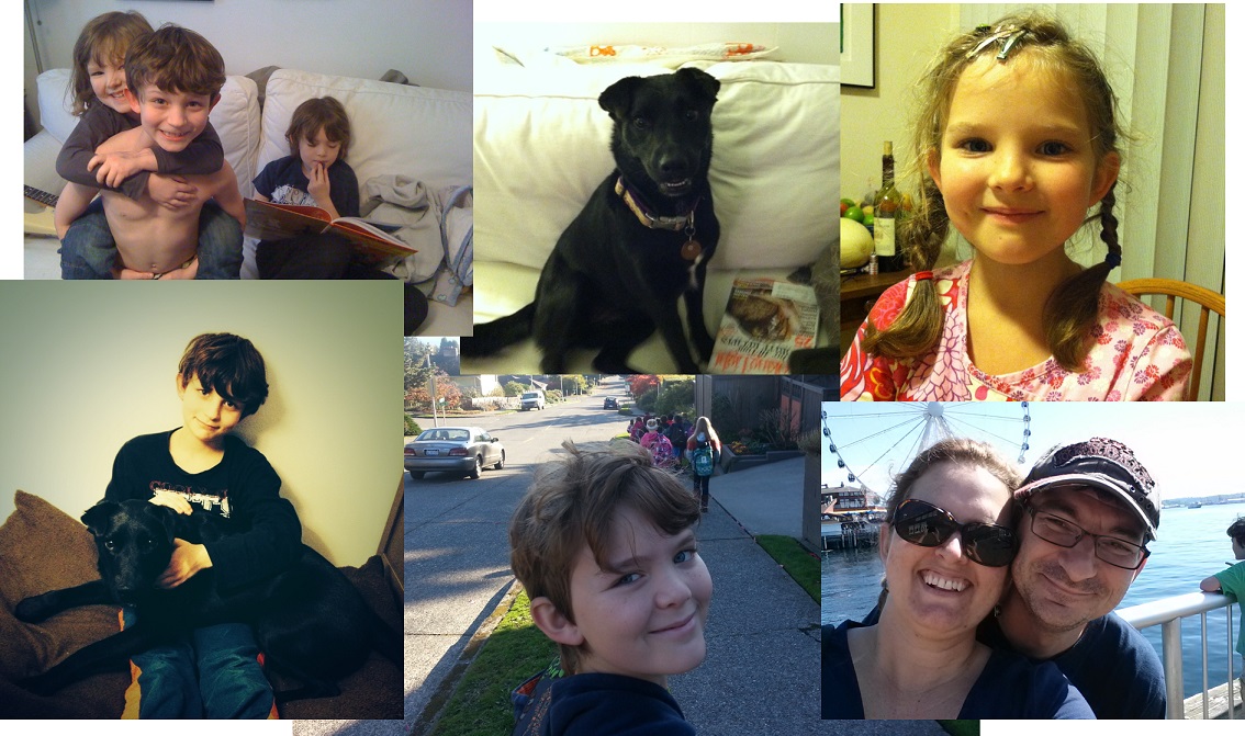 We’re French and American and, after twelve years of living in Eddy’s hometown of Grenoble, France, we moved (back) to Kelly’s (adopted) hometown of Seattle, Washington, USA in July, 2012. As the title of the blog suggests, we have three kids: Jonah, Owen and Kate. We also have four cats, Maggie Mae, Max, Harry, and Sam, and one dog, Penelope, otherwise known by the official title of The Best Dog Ever. Eddy is a musician and recovering IT systems administrator; I (Kelly) love my job in digital marketing for one of Seattle’s largest software companies (and fleshing out sentences by adding parenthetical clauses).